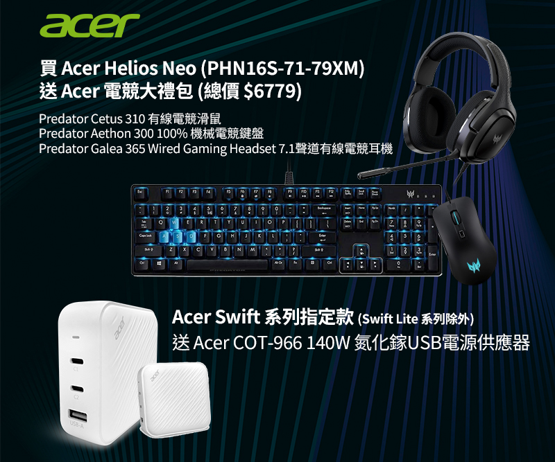 【活動贈品】:Acer 電競大禮包(內含鍵盤、滑鼠、耳機,總價 $6779!)
