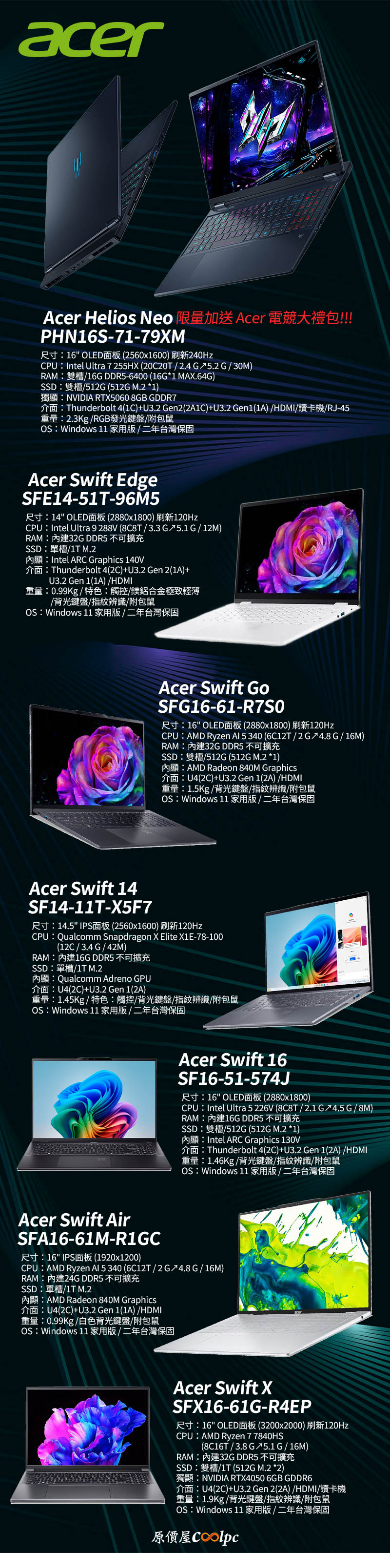 >>去原價屋蝦皮商城下單Acer Helios NeoAcer Swift 系列