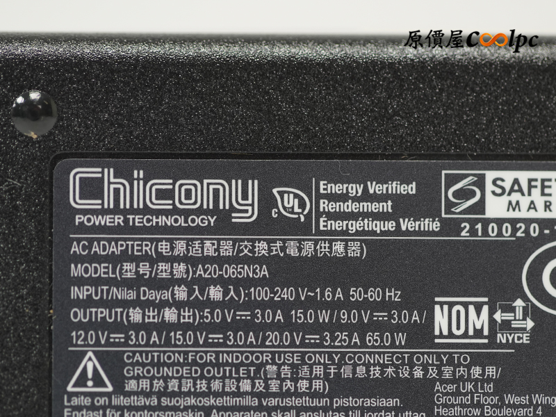 變壓器為群光電子的 A20-065N3A,最大輸出 20V、3.25A、65W。
