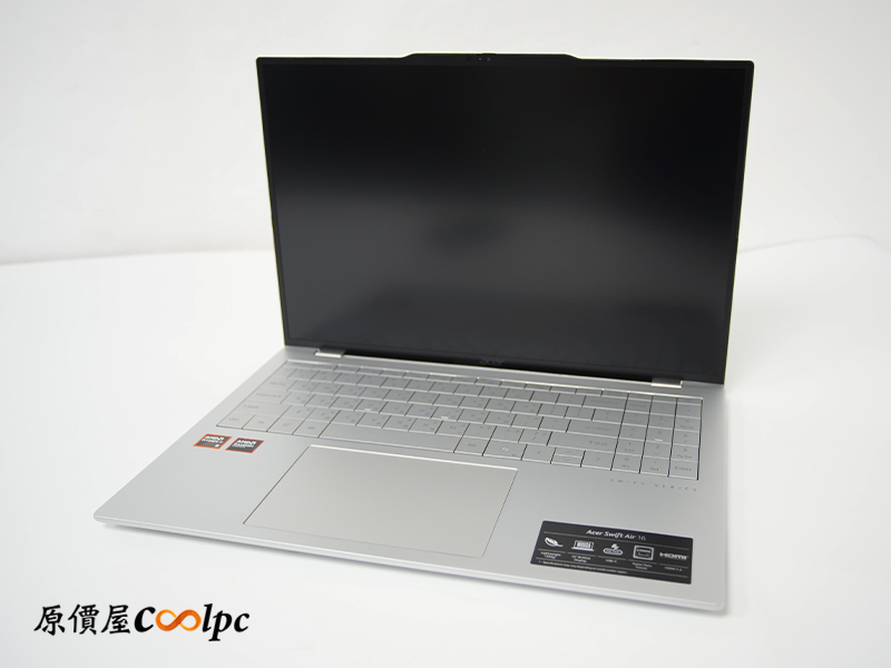 鍵盤採用與機身平行的全尺寸大鍵帽設計,提供極佳的敲擊反饋與視覺美感。下方貼有 AMD Ryzen AI 與產品規格貼紙,重點效能一覽無遺,展現出 Swift Air 系列在輕薄中追求極致效率的商務定位。
