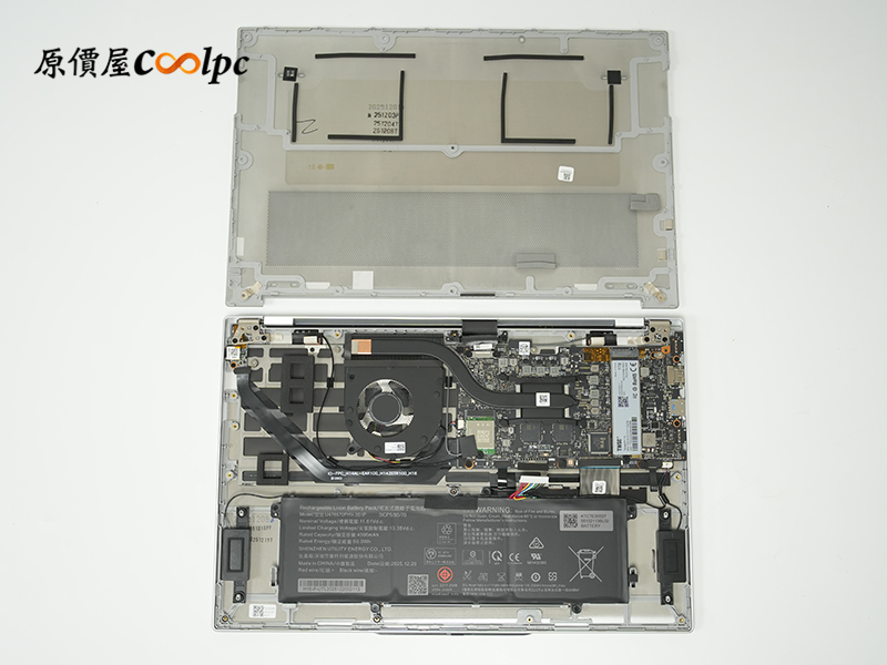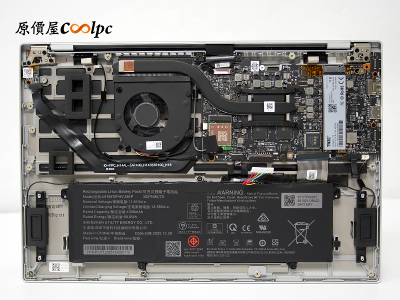 (點小圖放大)接著來看看內部用料吧!內部使用單風扇單導管散熱結構,記憶體顆粒焊在主機板上不可擴充,SSD 為單槽,選用 TWSC 的 1TB Gen4 硬碟,Wi-Fi 6 晶片為 芬維Fenvi RTL8852CE,鋰電池規格為 4306mAh / 50Wh 鋰離池。