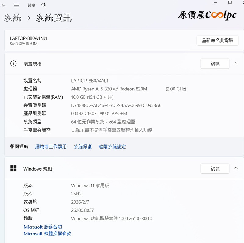 進入系統資訊可看見採用 AMD Ryzen™ AI 5 330 處理器、AMD Radeon™ 820M 內顯、16GB 記憶體、Win11 家用版等資訊。