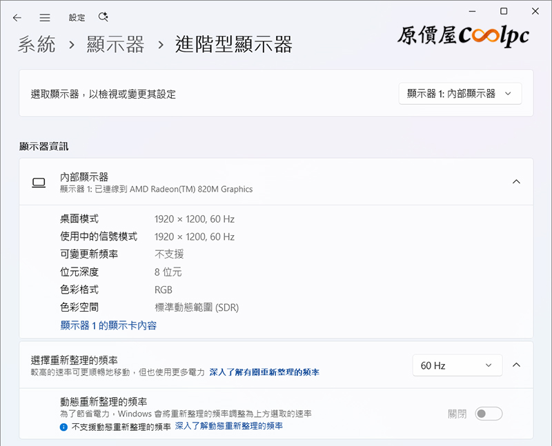 螢幕解析度為 1920 x 1200、8bit位元深度,螢幕更新率 60Hz。