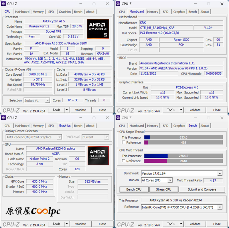 CPU-Z 顯示內部搭載AMD Ryzen™ AI 5 330 處理器(1P+3E)、記憶體 16Gb DDR5 6400MT/s、AMD Radeon™ 820M 內顯。