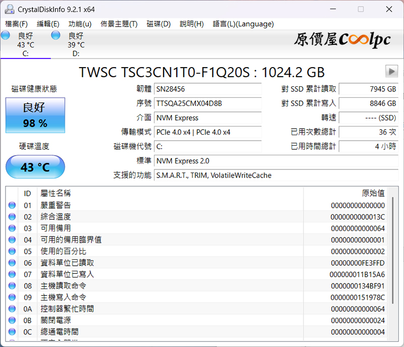 CrystalDiskinfo SSD監控軟體,內建 SSD 為 TWSC TSC3CN1T10-F1Q20S Gne4 1024GB SSD,支援 S.M.A.R.T、TRIM、VolatileWriteCache 功能。