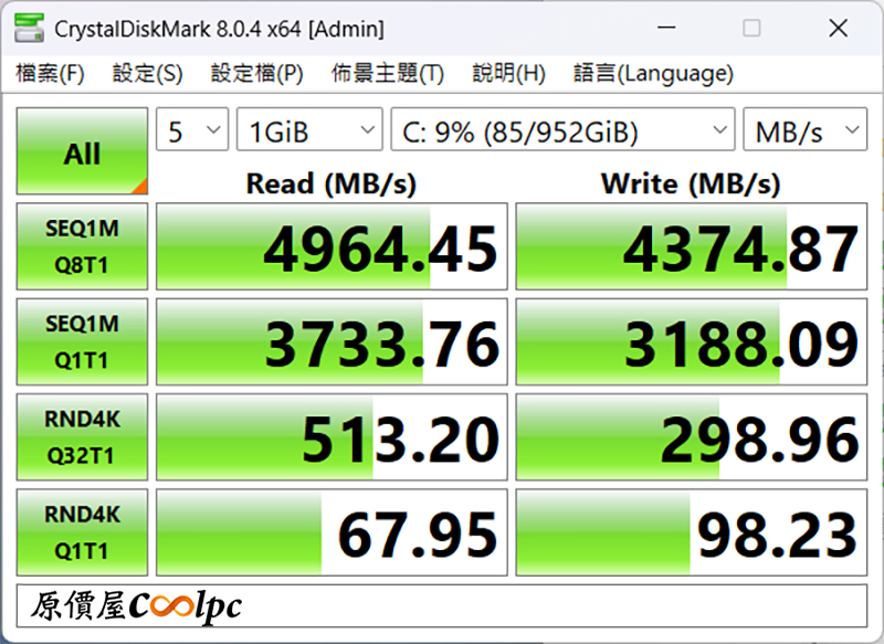 CrystalDiskMark 硬碟速度測試,最高隨機讀寫速度為 4964/4374 MB/s。