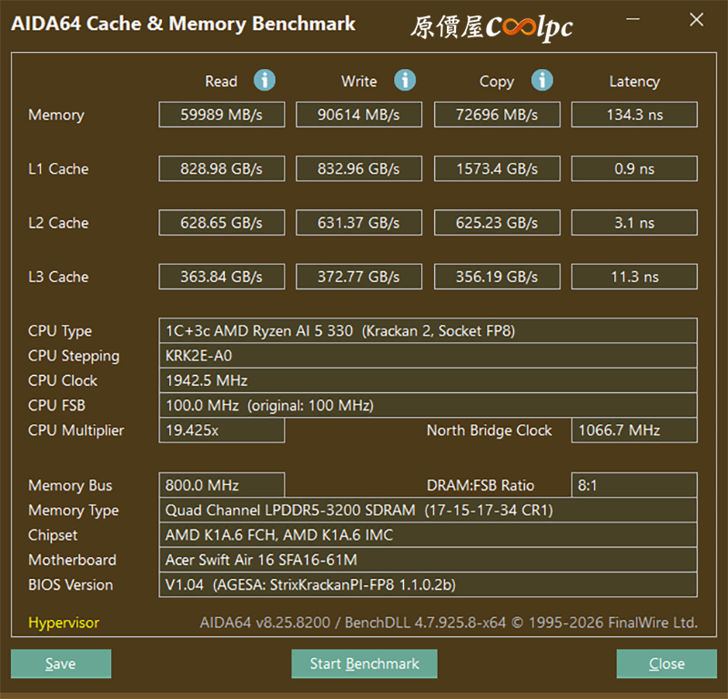 AIDA64 Cache & Benchmark 分數,Read 59989 MB/s、Write 90614 MB/s、Copy 72696 MB/s、Latency 134.3 ns。