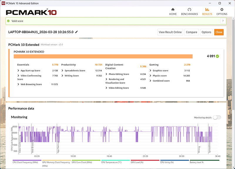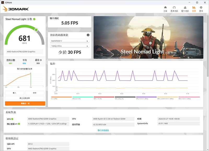 3D Mark 最輕度的 Steel Nomad Light 雖然只有少少的 5 FPS,但各位真的不用在意,因為這台的重點在於長續航跟極輕量化。反倒是文書機可以跑完低階遊戲測試讓小編非常訝異,代表穩定度很高!