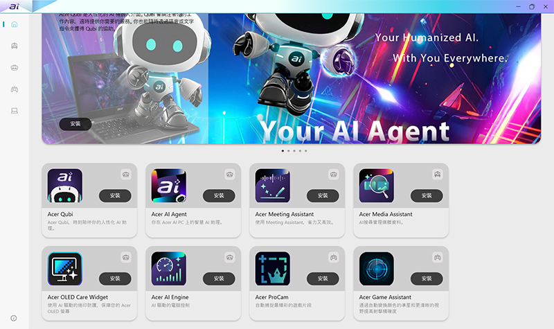 一台聰明絕頂的 Copilot+ PC 自然也有好用的生產力工具,Acer Intelligence Space 提供多種 AI 應用程式幫助你更輕鬆的完成日常任務,從個人小幫手 Acer Qubi、智慧助手 AI Agent、圖文生成 AI Drawing、再到遊戲輔助 Game Assistant,所有一切盡在此處,但既然定位是文書神機,那我們就專注在這些能幫你早點下班的好用 AI 軟體上。