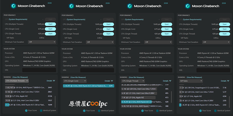 (點圖放大)Cinebench 2026 測試分數,CPU多核心 1649 pts、CPU單核心 679 pts、單核心線程 420 pts、多核心倍率 3.93。