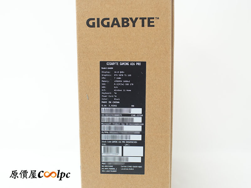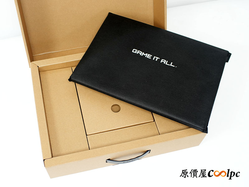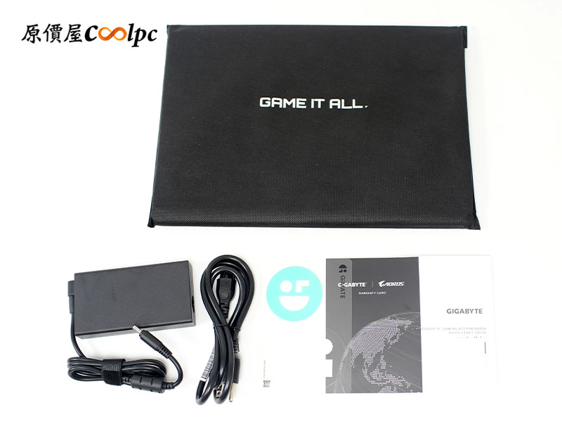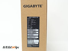 (點小圖放大)包裝走環保紙盒路線,正面印著「Game it all」標語,一看就知道是為玩家而生!右下角還能看到技嘉自家 AI 程式 GiMATE 的小圖示,側邊貼紙也列上了規格、序號和製造日期,資訊一目了然。