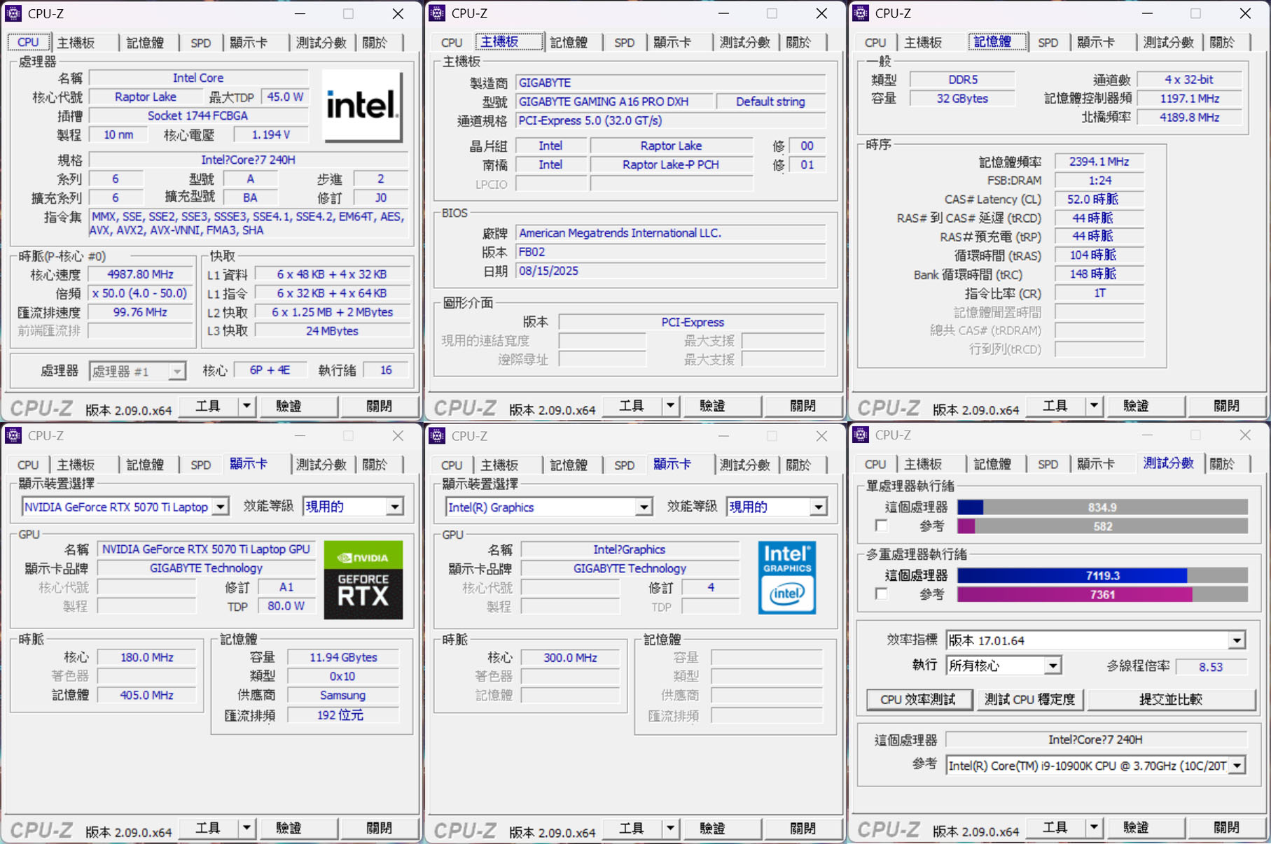 (點圖放大)CPU-Z 顯示 CPU 搭載 Intel Core 7 processor 240H 處理器(6P+4E核,16緒),內顯為 Intel Graphics 晶片,以及 NVIDIA GeForce RTX 5070 Ti Laptop GPU 12GB GDDR7 獨立顯卡。