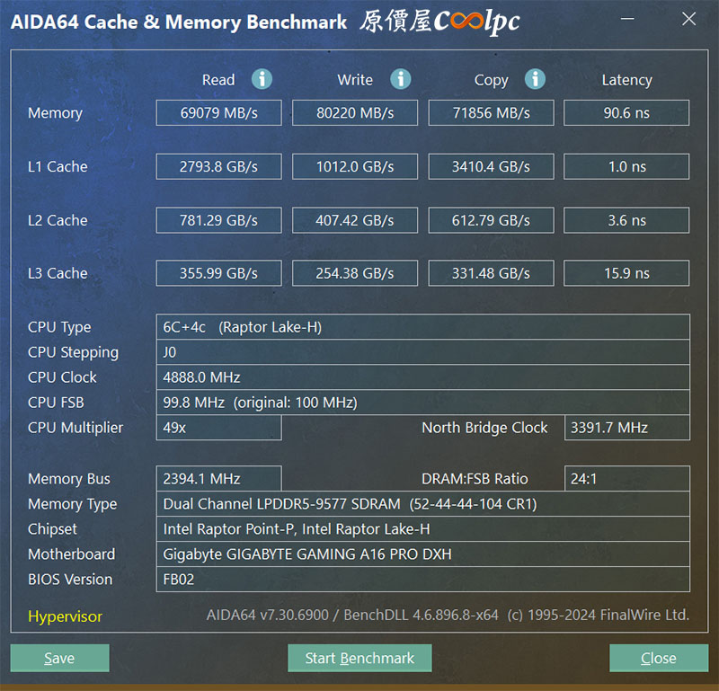 AIDA64 Cache & Benchmark 分數,Read 69079 MB/s、Write 80220 MB/s、Copy 71856 MB/s、Latency 90.6 ns。