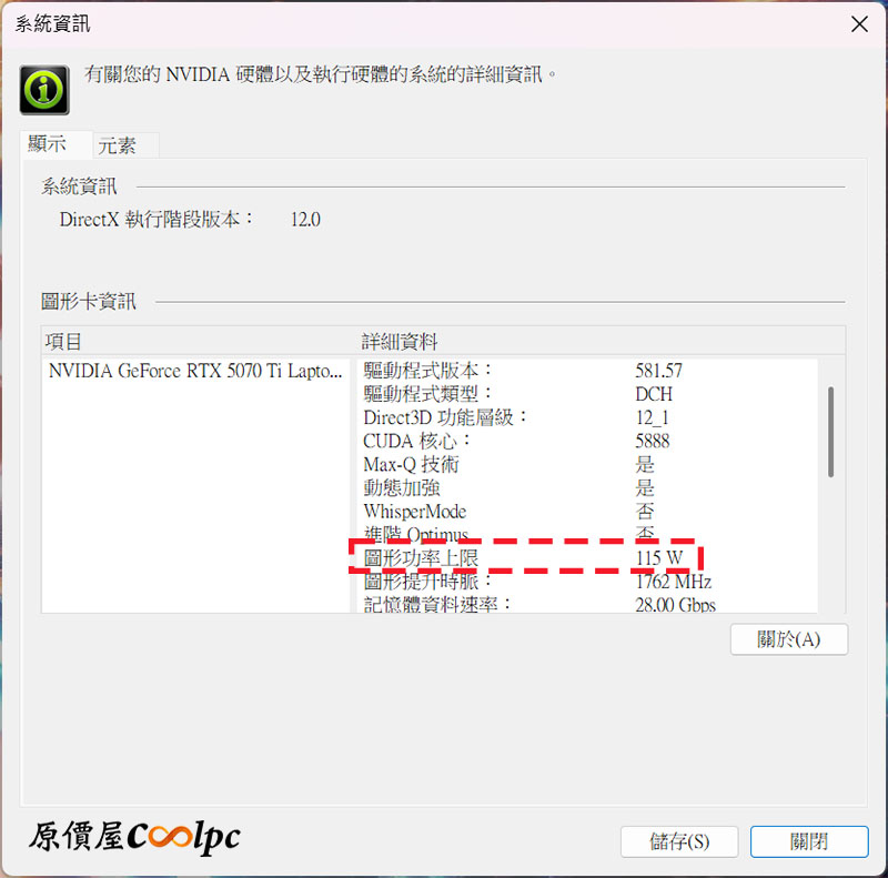 RTX 5070 Ti Laptop GPU 硬體詳細資訊,顯卡功率上限 115W。
