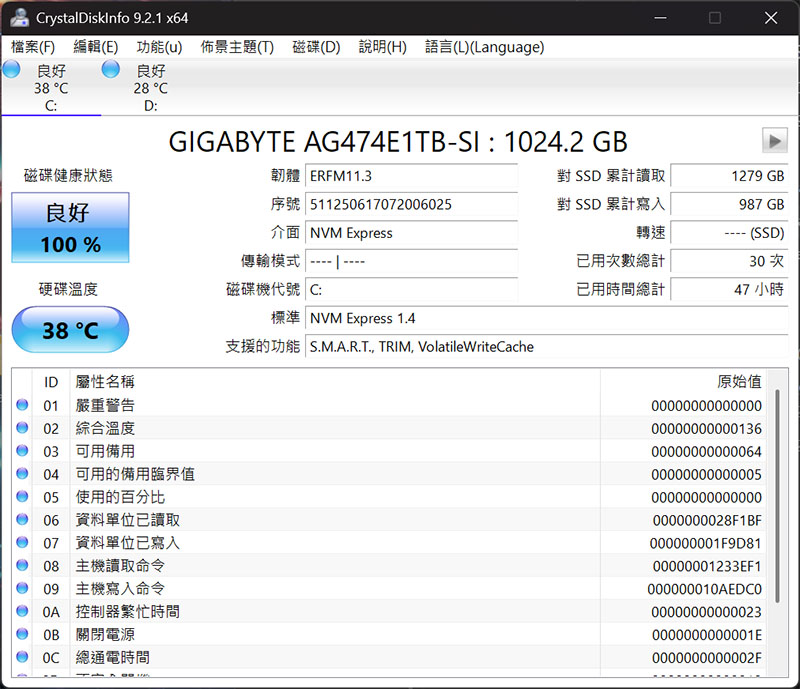 CrystalDiskinfo SSD監控軟體,內建技嘉 AG4474E1TB-SI Gne4 1024GB SSD,支援 S.M.A.R.T、TRIM、VolatileWriteCache 功能,
