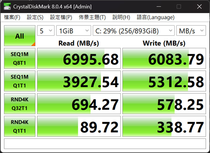 CrystalDiskMark 硬碟速度測試,最高隨機讀寫速度為 6995.68/6083.79 MB/s。