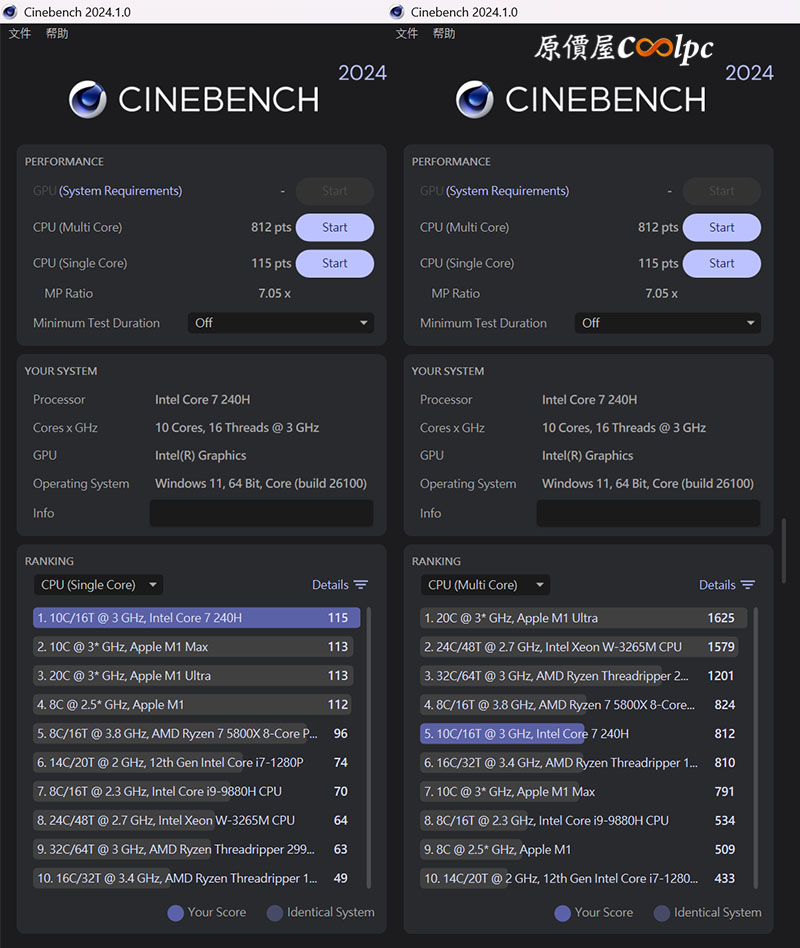 Cinebench 2024 測試分數,CPU單核心 115 pts、CPU多核心 812 pts。