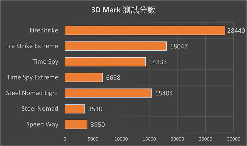 在 3D MARK 各項測試中,基於 DirectX 11 FHD 畫質的 Fire Strike 獲得 28440 的最高分,而 2K 畫質的 Fire Strike Extreme 則是 18047,再來是主流測試長出現的 Time Spy 與 Time Spy Extreme 也分別獲得 14333 與 6698 的優異成績;新一代非光追效能測試 Steel Nomad 與 Steel Nomad Light 分別獲得 15404 與 3510 分;要求最高的 Speed Way 測試則是獲得 3950,整體來說都在傳奇評分。