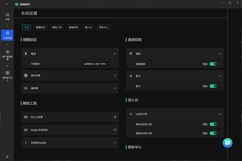 首頁下方的系統設置分頁也蠻豐富的,裡面包含 硬體設定、輔助工具、連線控制、個人化、更新中心 幾個區塊。像硬體設定可以微調風扇或螢幕亮度,輔助工具則是一些小幫手功能,連線控制可以管理網路優先權,讓遊戲不被卡。個人化能改介面主題、燈光效果,最後的更新中心就能一鍵檢查系統或驅動更新,整體介面還蠻直覺、集中好用。