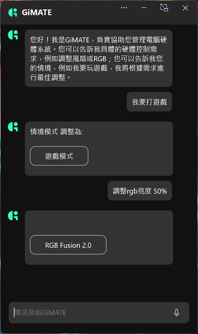 鍵盤右上角還藏了一顆 GiMATE 快捷鍵,一按下去就會跳出對話視窗。你可以直接講話或打字告訴它想幹嘛,像是要開遊戲、調效能、換燈效都行!GiMATE 會立刻幫你設定好,超直覺又方便~