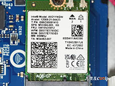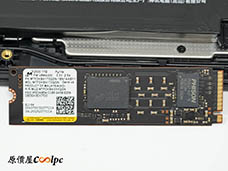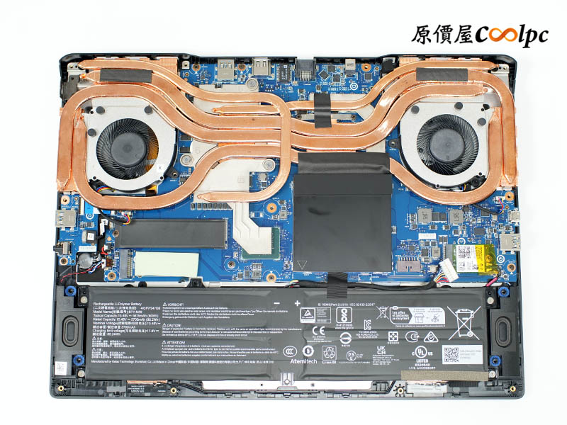 拆開 D 蓋後,映入眼簾的是非常有誠意的散熱佈局,這套 Cooler Boost 5 系統利用雙風扇搭配 5 根粗細不同的導管,能迅速將廢熱傳導至 4 個方向的散熱孔排出。而在黑蓋保護下的記憶體區,內建了一條三星 16GB DDR5-5600 記憶體,雙插槽最高可擴充到 96GB。儲存空間則由美光 1TB Gen4 SSD 坐鎮,旁邊還預留了一個 M.2 槽位供你隨時升級。至於連線與續航,則由支援 Wi-Fi 6E 的 AX211 網卡及 90Wh 大容量電池扛起重任,整體內部配置平衡且充滿戰力!