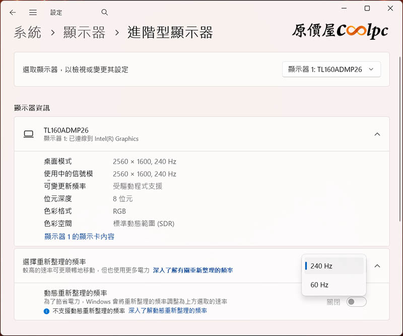 螢幕解析度是 QHD 2560×1600,支援 8-bit 色深,畫面細膩又飽滿;支援 240Hz/60Hz 更新率,相信各位玩家一定是 240Hz 用好用滿的啦!
