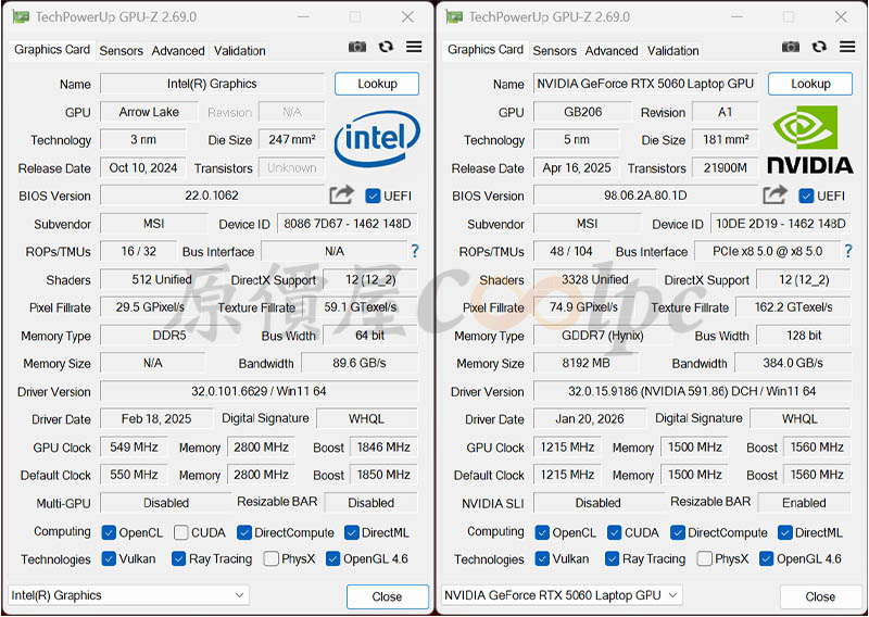 (點圖放大)CPU-Z 顯示 CPU 搭載 Intel® Core™ Ultra 7 processor 255HX 處理器(8P+12E核,20緒),內顯為 Intel Graphics 晶片,以及 NVIDIA GeForce RTX 5060 Laptop GPU 8GB GDDR7 獨立顯卡。