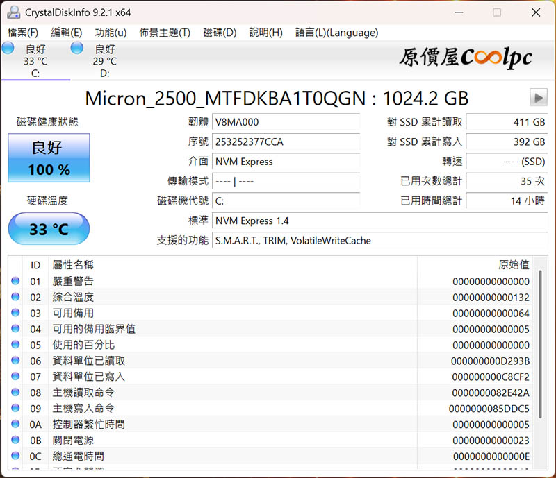 CrystalDiskinfo SSD監控軟體,內建美光 1TB NVMe SSD PCIe Gen4 SSD,支援 S.M.A.R.T、TRIM、VolatileWriteCache 功能。