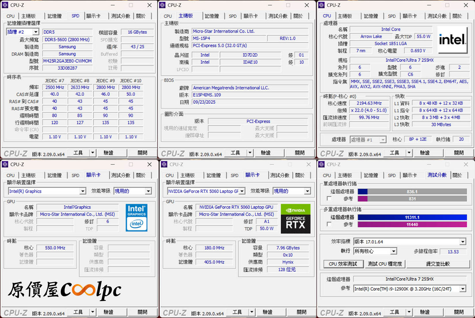 (點圖放大)CPU-Z 顯示 CPU 搭載 Intel® Core™ Ultra 7 processor 255HX 處理器(8P+12E核,20緒),內顯為 Intel Graphics 晶片,以及 NVIDIA GeForce RTX 5060 Laptop GPU 8GB GDDR7 獨立顯卡。