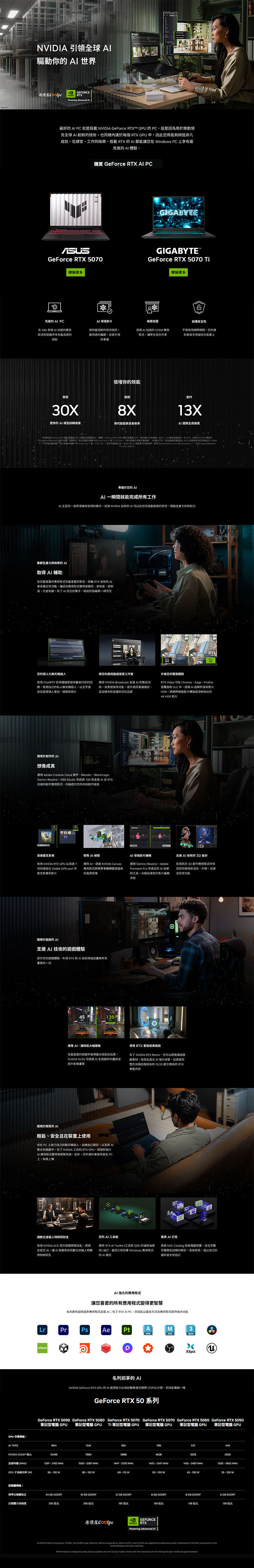 NVIDIA GeForce RTX 50 系列筆電 GPU 採用先進的 Blackwell 架構,為多元用戶需求提供卓越性能!搭載 Max-Q 技術,支援 AI 驅動的電源分配與散熱優化,讓筆電在運行高負載遊戲或創作任務時,溫度與續航力達到最佳平衡,輕薄設計與高效能表現,使其成為遊戲玩家、學生與輕量創作者追求高效與便攜的理想選擇;針對輕量級 AI 模型推理、遊戲優化、影片剪輯與日常創作等應用場景,展現無可比擬的競爭力!