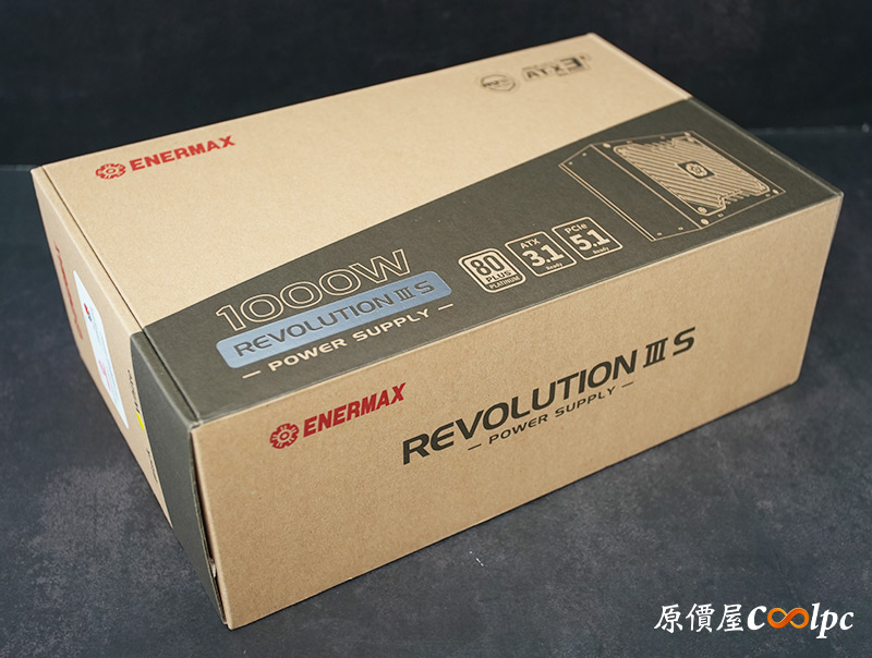 包裝相當的低調內斂,唯有品項「REVOLUTION III S」特別加入金屬名牌的效果,也把瓦數1000W拉大不少,旁邊還能看到80PLUS白金、ATX3.1、PCIe 5.1的字樣,並附上一張電源供應器的簡圖。