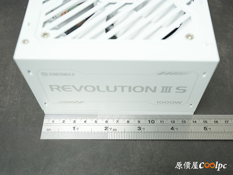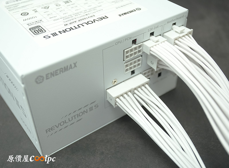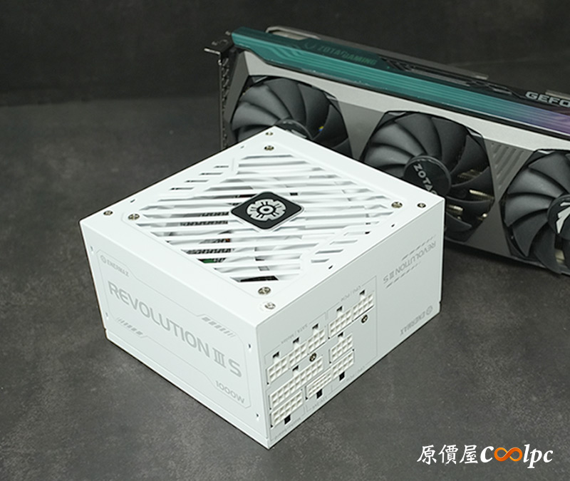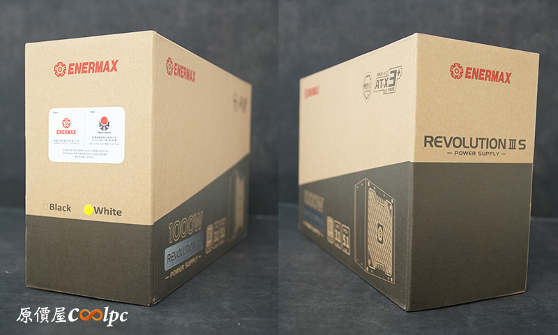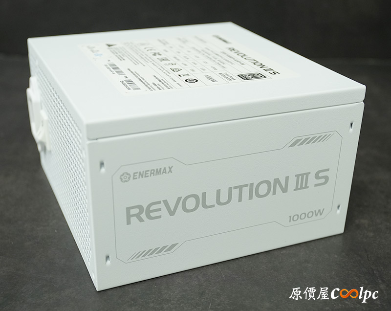 右側可以找到REVOLUTION III S字樣,左側則有保銳ENERMAX及代理商視博通LOGO,並註記電源顏色是白色版本。
