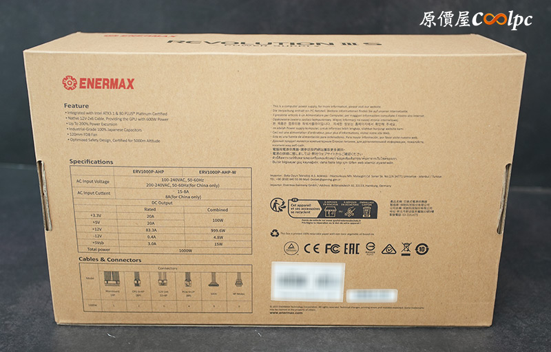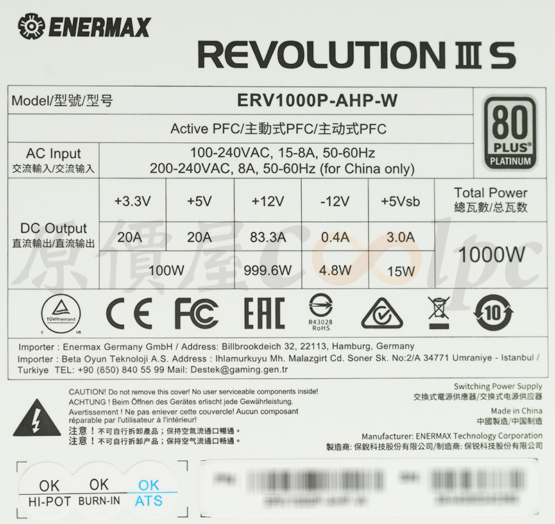電源背部有功率轉換貼紙,保銳REVOLUTION III S 1000W通過80PLUS白金認證,型號:ERV1000P-AHP-W,主動式PFC設計,支援100-240V國際電壓,在+3.3V/+5V時能提供20A 100W,+12V時能提供999.6W,總輸出1000W。