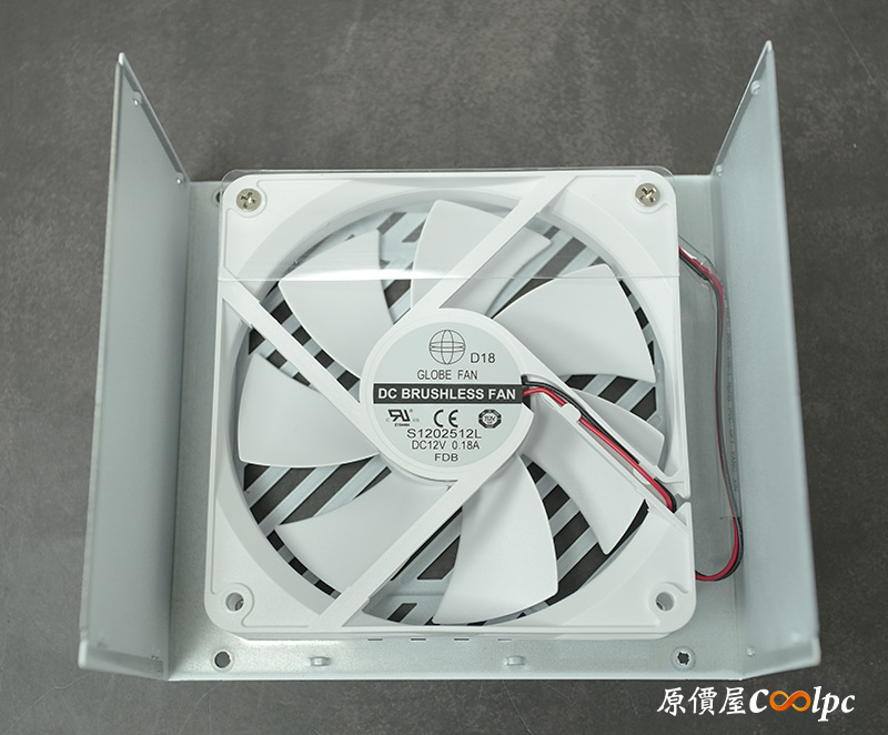 拆開可以看到風扇型號S1202512L,並附上導流板讓氣流更集中,強化散熱效果。