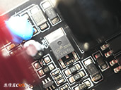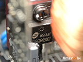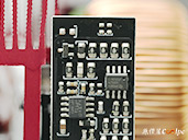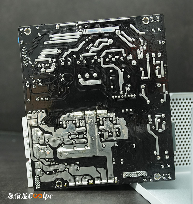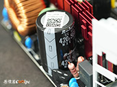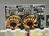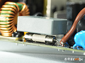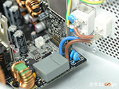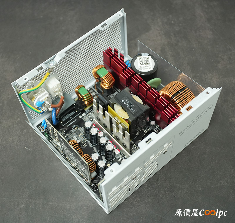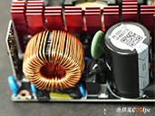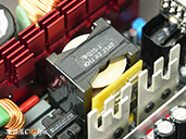 內部零件非常密集,保銳REVOLUTION III S 1000W是採用LLC諧振,結合DC-DC轉換架構,主動式PFC設計,全日系全模組化設計。在EMI電路有4個Y電容、2個X電容、一大一小的共模電感,一旁有橫躺的保險絲以及突波吸收器。APFC電路由1個Rubycon 420v 560µF主電容、1個APFC電感、1個NTC熱敏電阻組成,在APFC子卡上有SPN5003控制IC。紅色的散熱片下有橋式整流器,還有2個SLF60R090E7 APFC MOSFET、1個DSC10A065 APFC二極體、4個CS25N50FF一次側MOSFET,中央的散熱片下則有AGM4012C二次側同步整流MOSFET。DC-DC電路有兩個環形電桿、2個APW7164 PWM控制器,旁邊的子卡上有IN1S313I電源管理IC。模組化輸出端有數顆固態電容與電解電容濾波。
