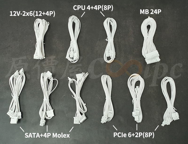 全模組化的線材一覽,有主機板MainBoard 24Pin,兩條CPU 4+4Pin為主機板超頻提供更穩定的供電,12V-2×6是高階RTX顯卡的16Pin供電,傳統顯卡的PCIe 6+2Pin也沒少,SATA和Molex則做在同一條。
