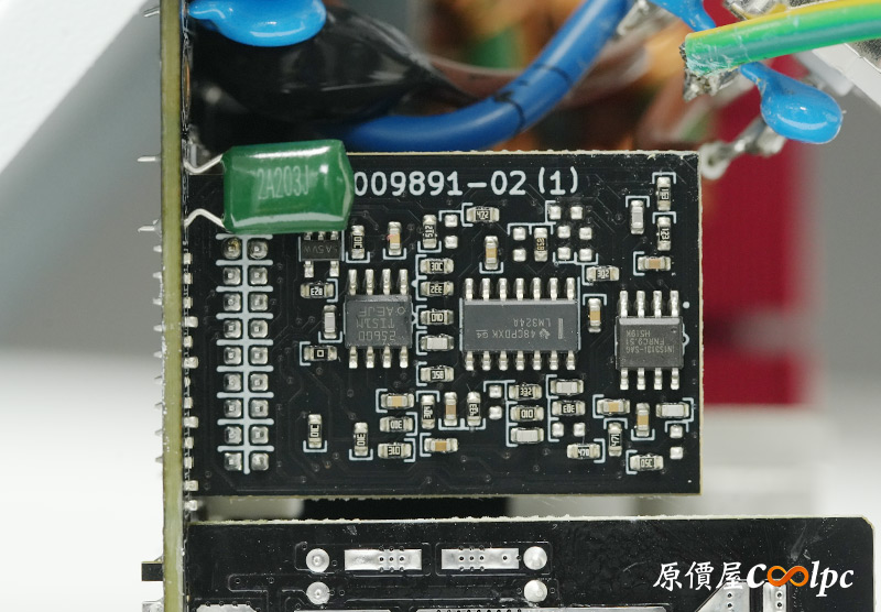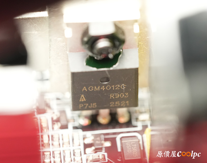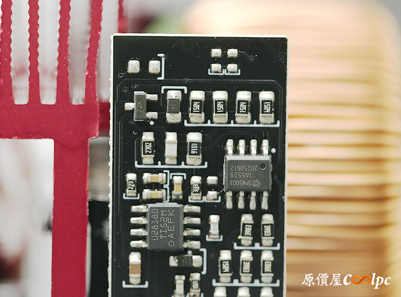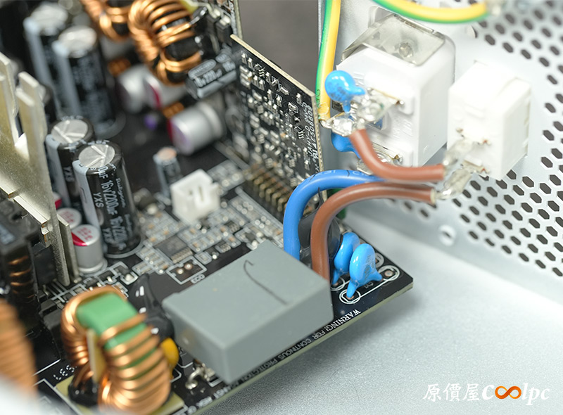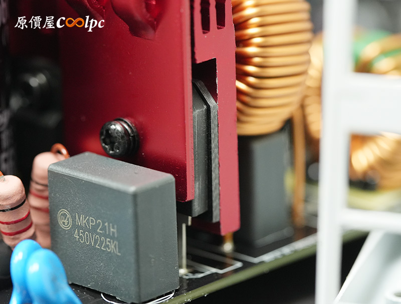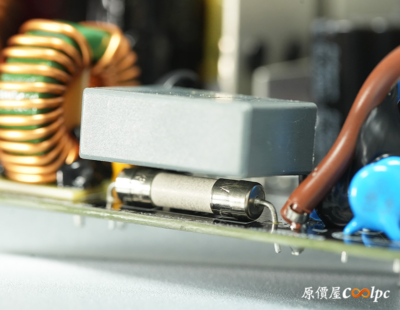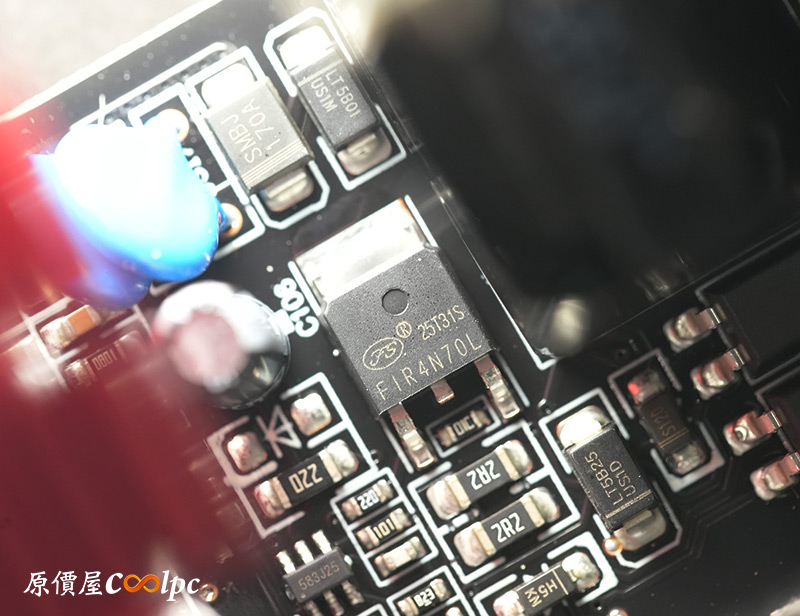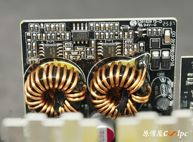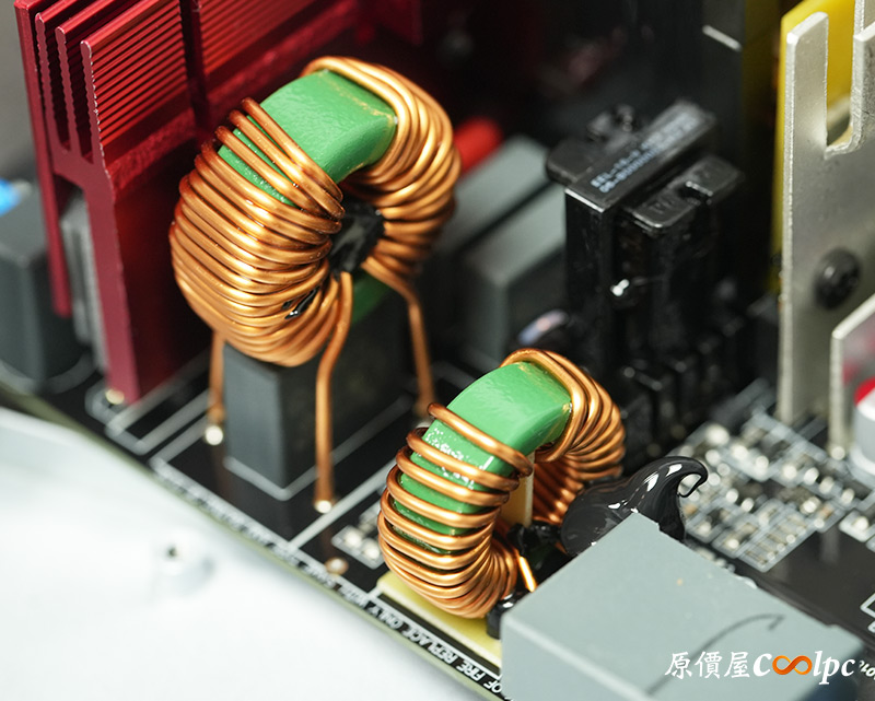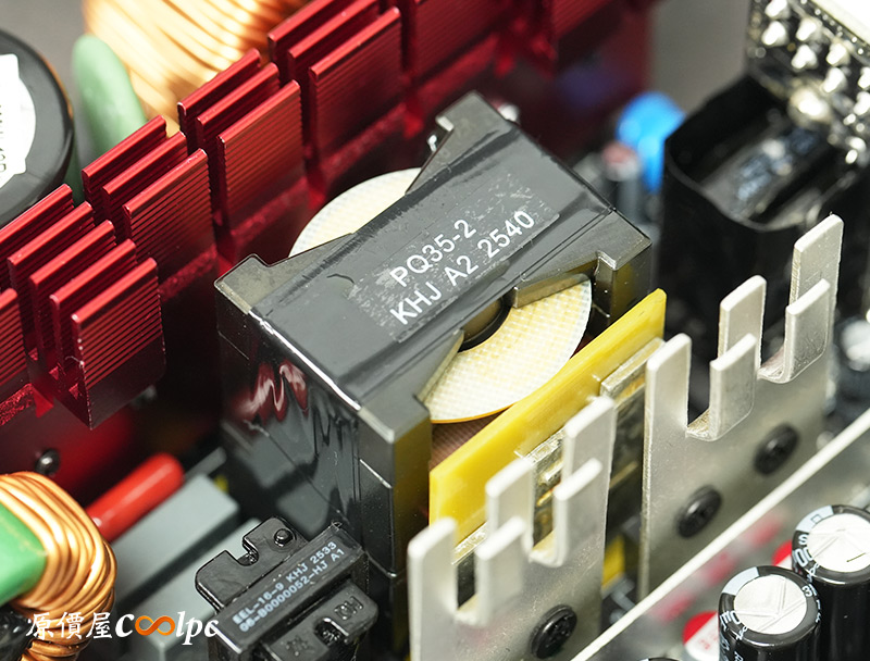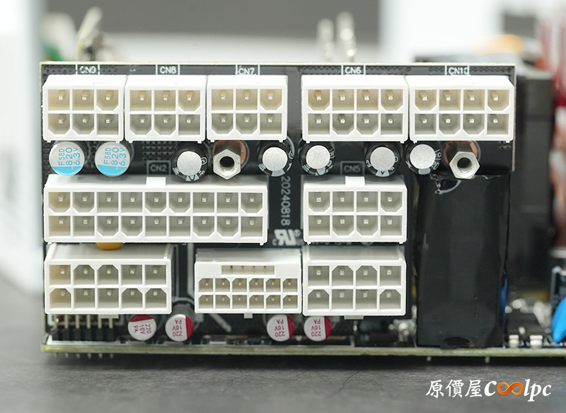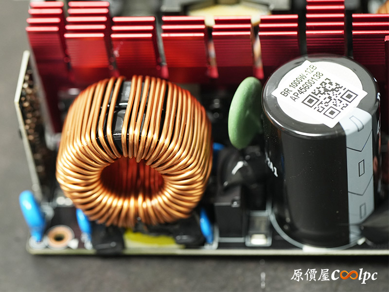 內部零件非常密集,保銳REVOLUTION III S 1000W是採用LLC諧振,結合DC-DC轉換架構,主動式PFC設計,全日系全模組化設計。在EMI電路有4個Y電容、2個X電容、一大一小的共模電感,一旁有橫躺的保險絲以及突波吸收器。APFC電路由1個Rubycon 420v 560µF主電容、1個APFC電感、1個NTC熱敏電阻組成,在APFC子卡上有SPN5003控制IC。紅色的散熱片下有橋式整流器,還有2個SLF60R090E7 APFC MOSFET、1個DSC10A065 APFC二極體、4個CS25N50FF一次側MOSFET,中央的散熱片下則有AGM4012C二次側同步整流MOSFET。DC-DC電路有兩個環形電桿、2個APW7164 PWM控制器,旁邊的子卡上有IN1S313I電源管理IC。模組化輸出端有數顆固態電容與電解電容濾波。
