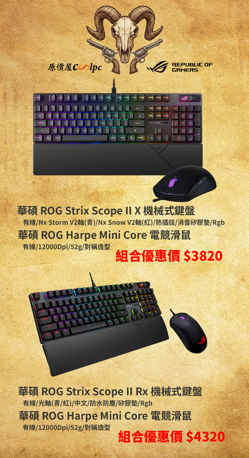這套組合現在買起來真的很划算,NX 鍵盤組只要 3820 元,RX 光軸組也只需 4320 元。如果你正在考慮升級裝備,這波 ROG 組合絕對值得參考,現在全台門市與蝦皮商場同步優惠中,活動數量有限,售完為止,趕快去把裝備補齊吧!