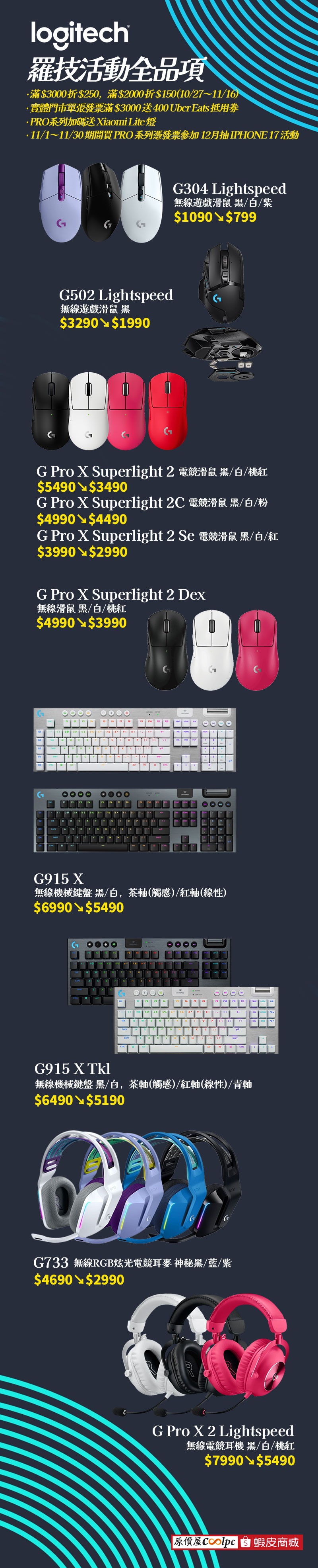 來看看這次到底有什麼厲害的活動品項吧!先來看看這波滑鼠優惠有多少?經典的「G304 Lightspeed 無線滑鼠」只要 $799(原價$1090)?,還有三色隨你挑,輕巧、靈敏又省電,是入門電競的不二之選啊!有沒有想進階的玩家啊?「G502 X 系列」現在下殺 $1490 起,人體工學設計搭配雙模式滾輪,不論是爆頭還是報告,都能精準出擊!而頂級戰神級滑鼠「G Pro X Superlight 2 / 2C / 2 SE / DEX」更是史上最大降幅,最低還只要 $2990 起!不到三千元就能體驗到頂尖玩家的神級操控,這樣的價格甚至比你吃一頓燒肉還便宜呢!再來就是鍵盤了,羅技的「G915 X 系列無線機械鍵盤」這次也有參加,一樣也同步開搶!不論是全尺寸還是 TKL 無數字版本,青軸、紅軸、茶軸 全都有,原價近 7 千元的高階鍵盤,雙 11 限時只要 $5190 起!超薄鋁合金外型加上 LIGHTSPEED 無線技術,低延遲、高質感,打字、打遊戲都一樣流暢!最後就是耳機了,玩遊戲怎能沒有神級聽覺呢?「G733 無線 RGB 炫光耳麥」現在只要 $2990!RGB 燈效搭配輕量化設計,戴上就像開啟主角模式!另外追求極致音場的玩家,更不能錯過「G Pro X 2 Lightspeed 無線耳機」,原價$7990,雙 11 直接降到 $5490,DTS Headphone:X 2.0 音效+40mm Graphene 振膜,讓你聽聲辨位如開掛!這次品項內容真的超豐富,玩家朋友你一定能在這次找到你需要的,可不要錯過了~
