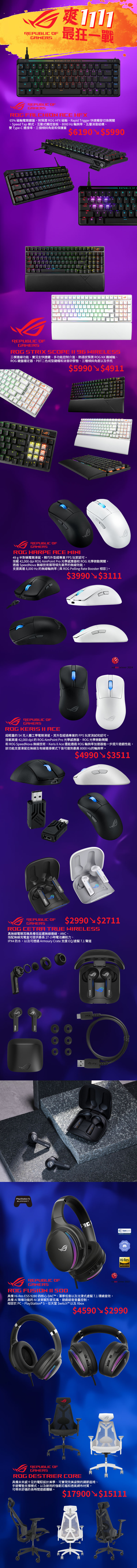 再來說說人氣爆棚的 ROG Strix Scope II 96 無線機械式鍵盤,現在可是直接大砍一千,黑白雙色、青紅雙軸一次齊發!96% 佈局兼具完整功能與節省桌面空間,三模連線自由切換,支援 2.4 GHz、藍牙與 Type-C,RX 光軸回饋乾脆、手感穩定還防塵防晃,長時間打字或遊戲都相當舒適。玩家一致好評的手感現在正是入手時機!優惠的兩款滑鼠也是必收,Harpe Ace Mini 只有 49g,輕到幾乎感覺不到重量,但卻塞進 36,000 DPI 感測器與 8000 Hz 輪詢率,甩槍順狙行雲流水,重點是原價快四千現在也降價到三千出頭,超級優惠;想追求更進階可考慮 Keris II Ace,因為更快速的 42,000dpi 才跟上你的神手,外觀設計更加圓潤飽滿,手感也更好,這次優惠更是狂降千元,最優惠肯定選它!若跟 Falchion Ace HFX 搭在一起簡直是打片天下無敵手啊!