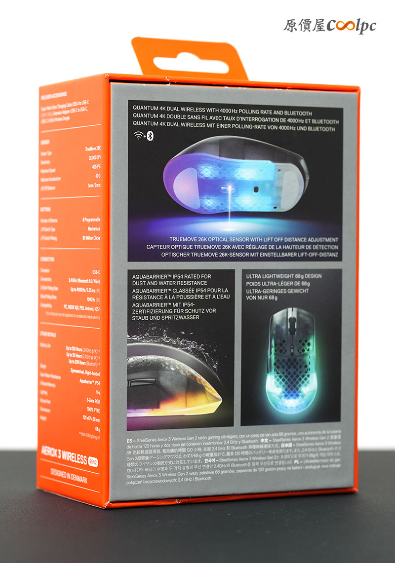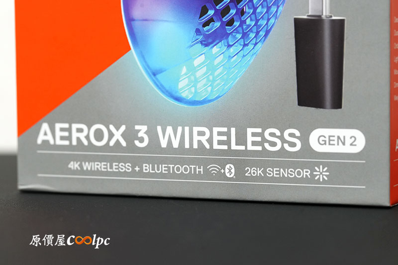 橘色系包裝搭配本體實拍圖,正面除了有產品型號名稱,也直接標示 4K Wireless+Bluetooth 的雙模連線,一眼就知道這次主打高速無線規格。盒面也清楚呈現 Aerox 系列經典鏤空設計。