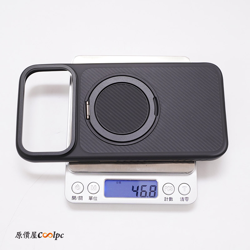 手機殼採用 TPU(熱塑性聚氨酯)製成,底部可以看到克維拉纖維圖案,那塊真的超級無敵硬,保護手機背板絕對沒有問題。背後還有一個可 360 度旋轉的支架,旋轉還會有喀喀聲,支援橫向與縱向模式站立。