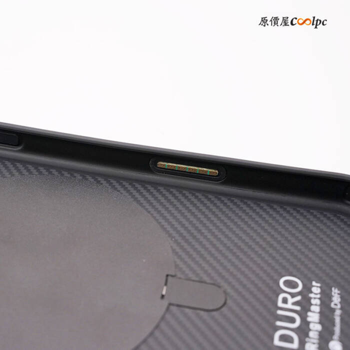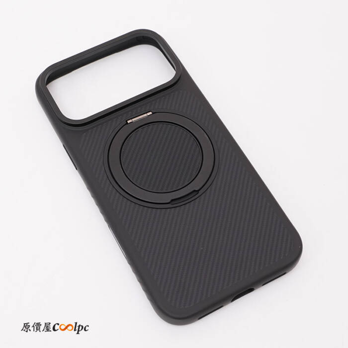 手機殼採用 TPU(熱塑性聚氨酯)製成,底部可以看到克維拉纖維圖案,那塊真的超級無敵硬,保護手機背板絕對沒有問題。背後還有一個可 360 度旋轉的支架,旋轉還會有喀喀聲,支援橫向與縱向模式站立。