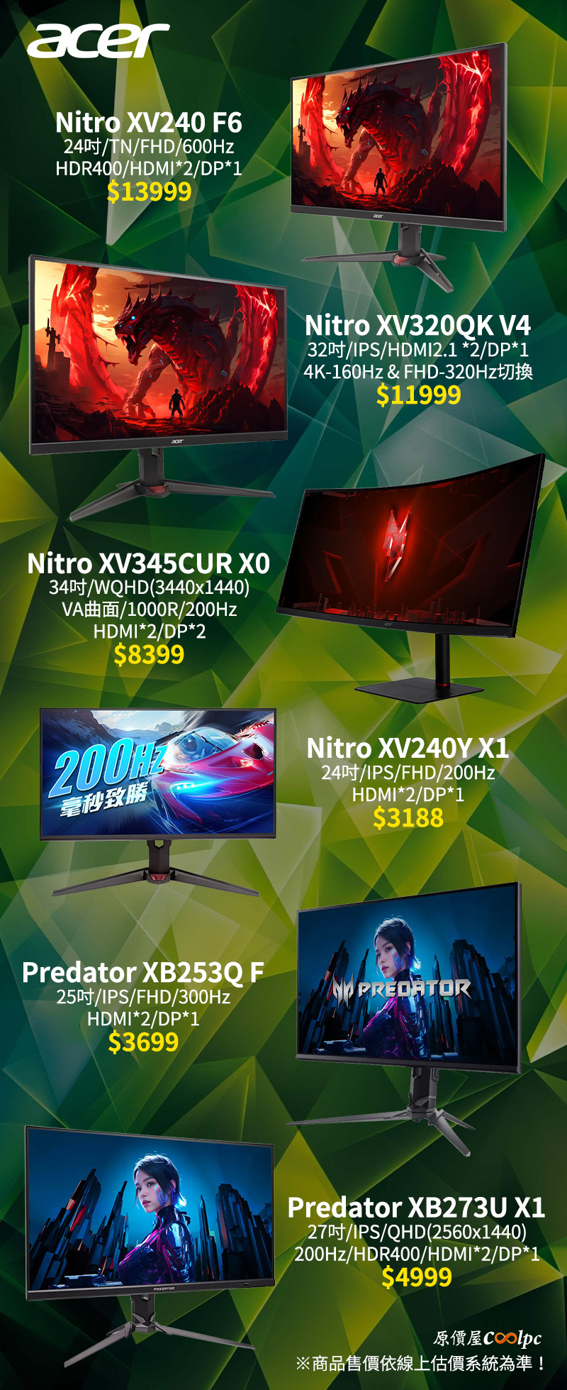 NITRO與Predator都是ACER旗下的高階電競款,代表性能肯定是不差,這次優惠的NITRO XV系列就有各式各樣特性不同的機種,如果是追求CP值的話,首選24″ NITRO XV240Y X1,只要三千多就能買到200Hz畫面刷新率,還有HDR10加持更加生動真實。注重螢幕速度的FPS玩家最推薦24″ TN面板的NITRO XV240 F6, 透過600Hz極致刷新率,敵人一舉一動都看得一清二楚。畫質與速度兼具就要選32″ NITRO XV320QK V4,4K 160Hz或是FHD 320Hz可以一鍵切換,玩3A大作能盡情享受特效細節,玩射擊遊戲速度也不落人後。追求畫面沉浸感就交給34″ NITRO XV345CUR X0,1000R超曲面包覆視野,彷彿置身於遊戲世界中,享受身歷其境的視覺體驗。另外Predator XB系列的