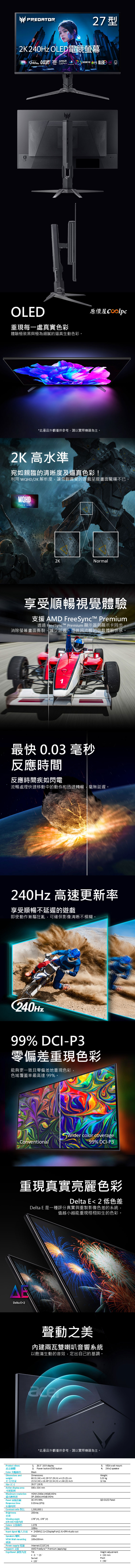 不用一萬的OLED螢幕你敢信? 你是否一直渴望OLED的極致視覺體驗? 那細膩的畫面、飛快的速度與驚豔的色彩,無一不令人感到羨慕。現在ACER PREDATOR X27U W3螢幕正式打破市場行情,直接殺到$9999元!這台搭載QD-OLED面板,擁有27″ WQHD(2560 x 1440)解析度,畫面更新率高達240Hz,反應時間也只有0.03ms(GTG),還能透過AMD FreeSync Premium減少畫面撕裂、延遲,色彩更是支援10.7億色、10Bits色深、99% DCI-P3 廣色域、Delta E<2低色差,還有HDR10 高動態加持,低藍光護眼功能。I/O則提供2x HDMI 2.1、1x DisplayPort 1.4、1x AUDIO out、2x 2W喇叭,而且原廠螢幕支架符合人體工學,可以高低調整(150mm)、左右旋轉(±20°)、樞軸旋轉(±90°)、傾斜(-5°~25°),也能搭配VESA 100 x 100mm規格螢幕支撐架使用。總結27″大小本身就很適合遊戲,3A大作需要的畫面細節與色彩有了,FPS競技注重的速度也有了,現在價格都漂亮了,可以說從沒有這麼佛的優惠啊!目前ACER PREDATOR X27U W3螢幕在原價屋獨家販售,數量有限售完為止,有興趣敬請把握機會啦。