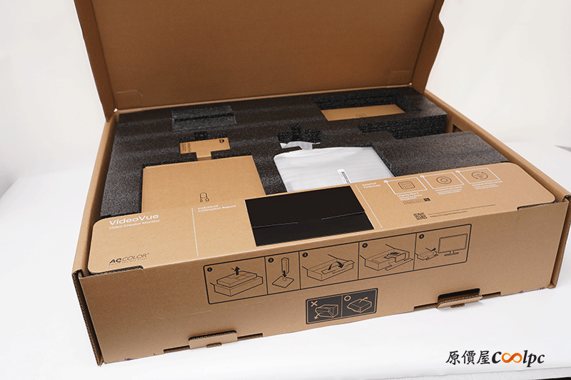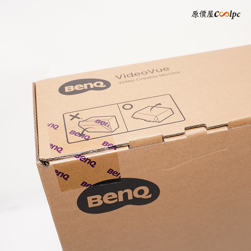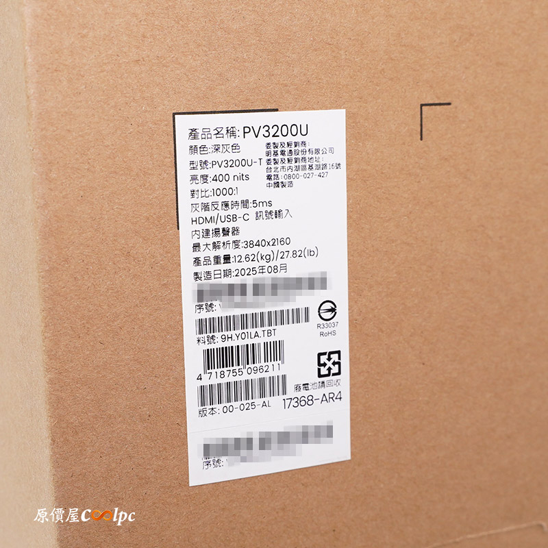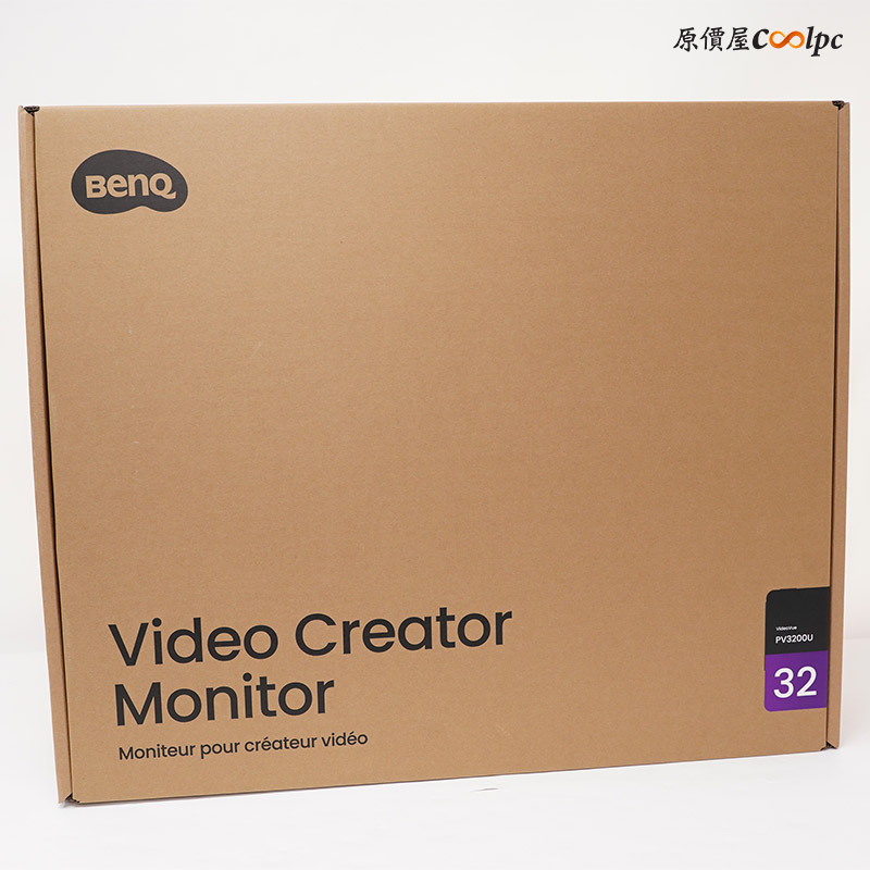 這台 32 吋接近正方形外盒超大,前方有 Video Creator Monitor 影音創作螢幕,旁邊貼紙則是型號 PV3200U 跟 32 尺寸,側面貼紙簡易的規格介紹,和產品製造日期和序號等資訊。外盒頂部也有教學外盒拆封,必須躺平,禁止直立打開。