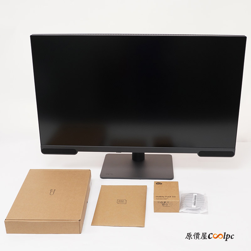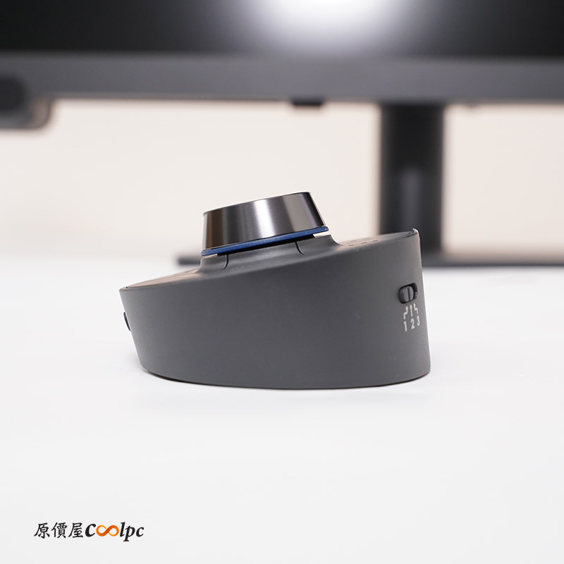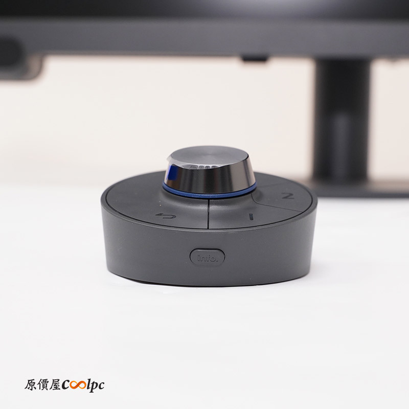 包裝內容包括螢幕本體、配件盒、快速安裝指南、無線控制器(Hotkey Puck)及纜線固定器。配件盒內含電源線、兩顆四號電池及 USB-C 線材。Hotkey Puck 為紅外線無線控制器,需安裝兩顆四號電池方可使用,控制器頂部設有旋鈕鍵、循環鍵、返回鍵及快速鍵 1/2/3,正面為資訊鍵,背面則提供紅外線頻道切換設定,方便在多台螢幕間快速切換。安裝時,請先將纜線固定器裝於螢幕支架,再安裝螢幕,以免需重複拆卸。另外需要纜線固定器,請先裝好在螢幕支架上,最後再安裝螢幕,不然會跟小編一樣又多拆一次!