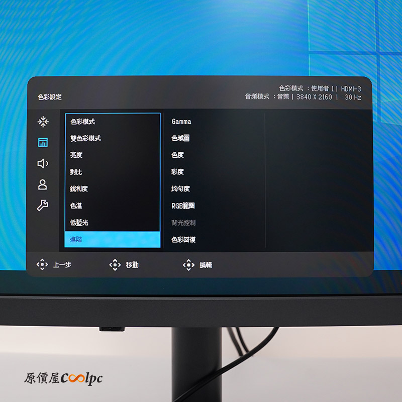 色彩設定使用使用者模式,可以調整對比、色溫、低藍光模式。