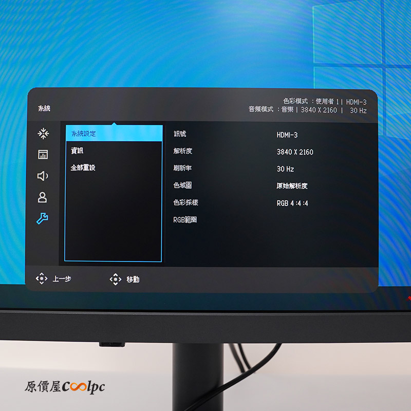 功能選單有顯示、色彩設定、音效設定、自訂鍵、系統五個大項可以調整。