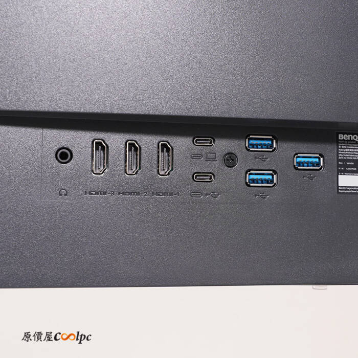 後方 I/O 有 3.5mm 耳機插孔、3 x HDMI 2.0 、2 x USB-C (上方 powerDelivery 65W, DisplayPort Alt Mode, Data;下方 USB 3.2 Gen 1, 5 Gbps, 電力充電 7.5W)、3 x USB-A (USB 3.2 Gen 1, 5 Gbps, 電力充電 7.5W)
